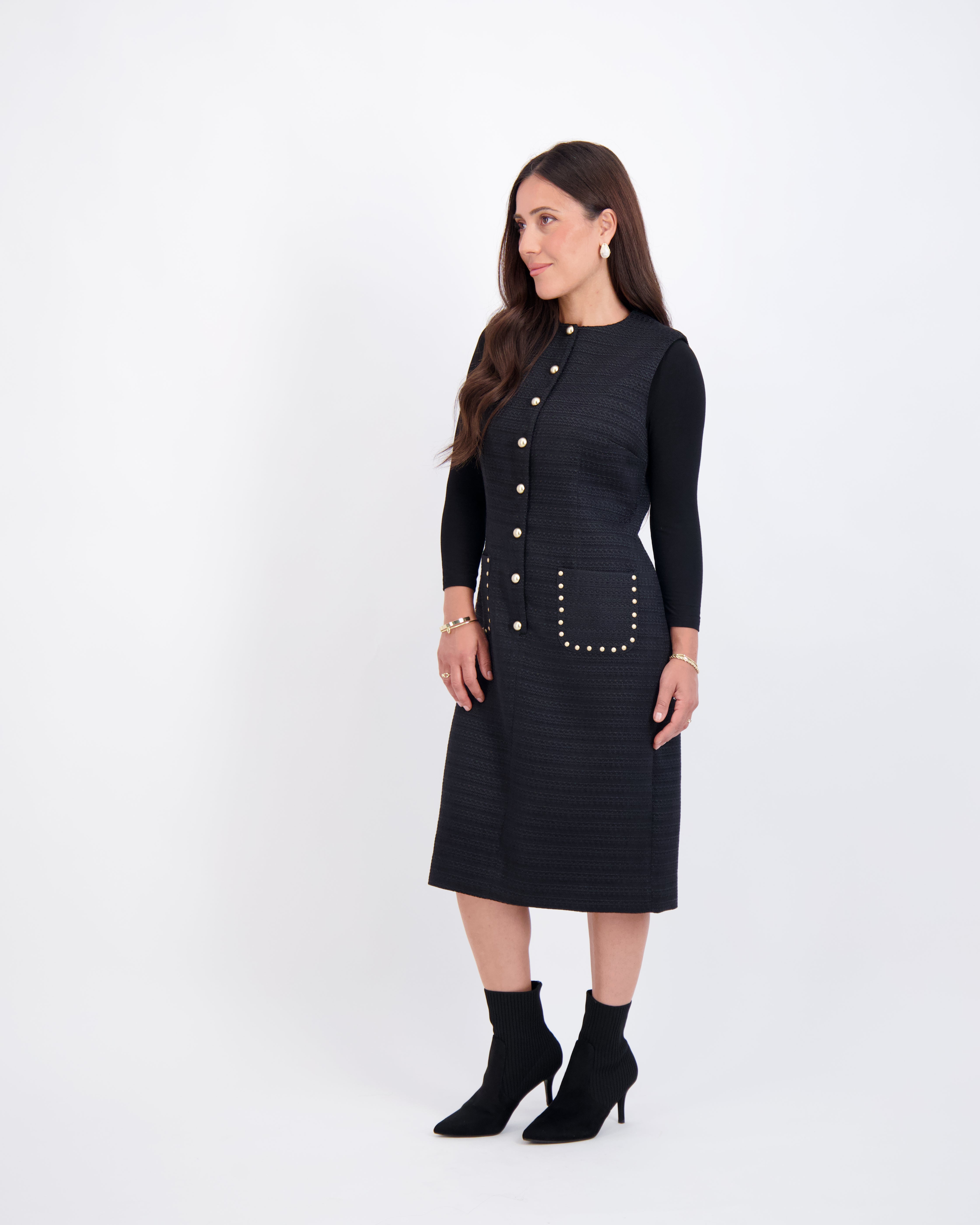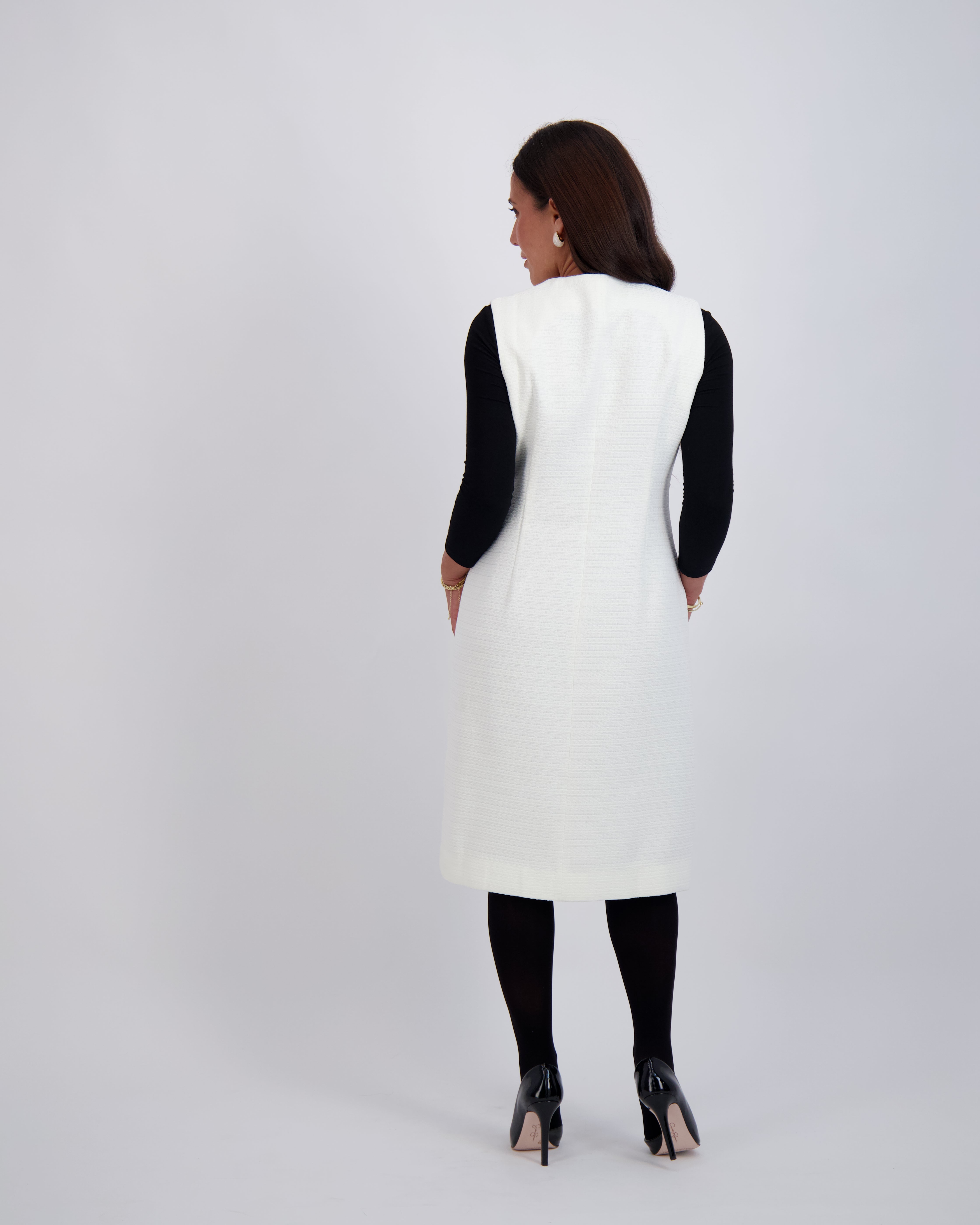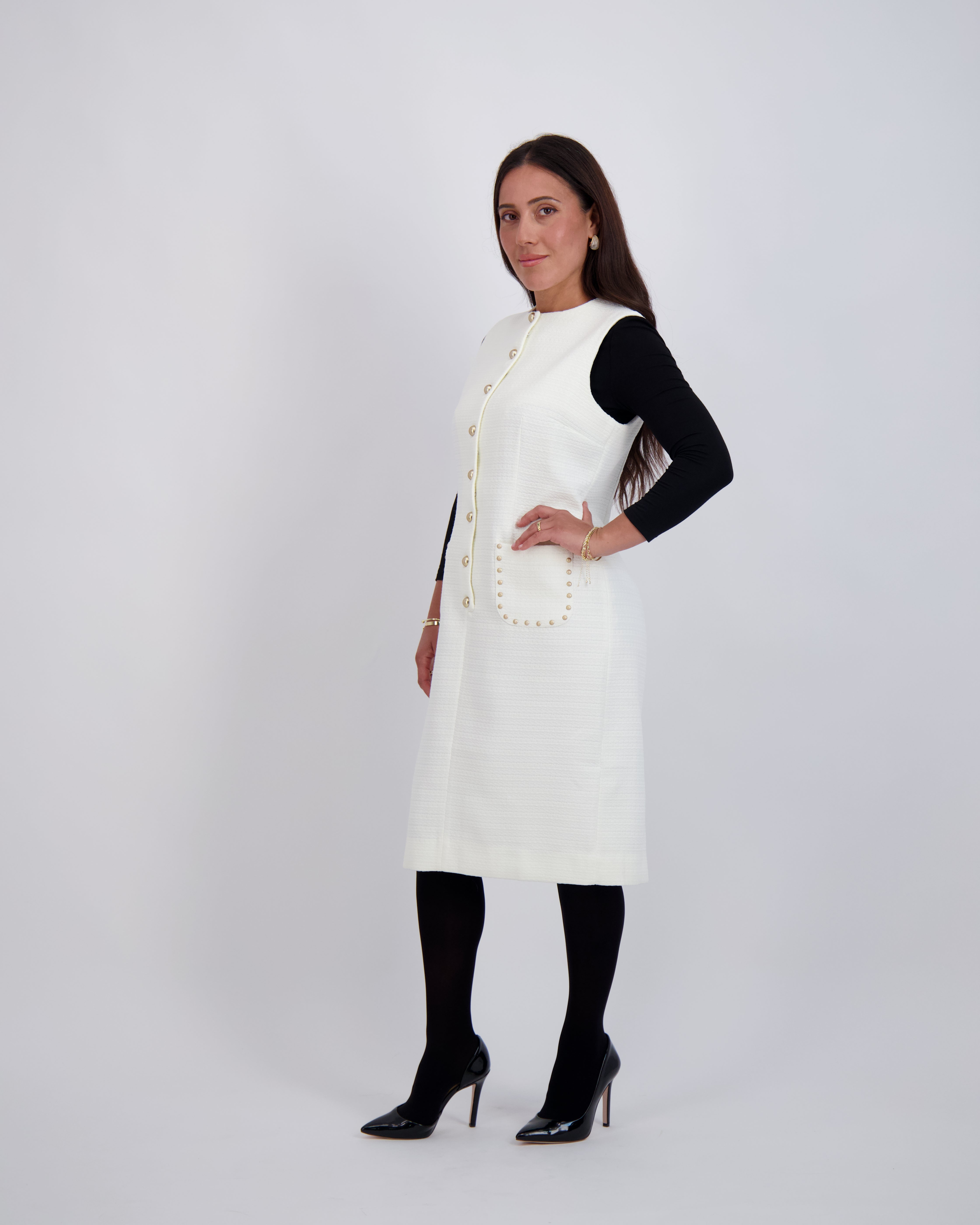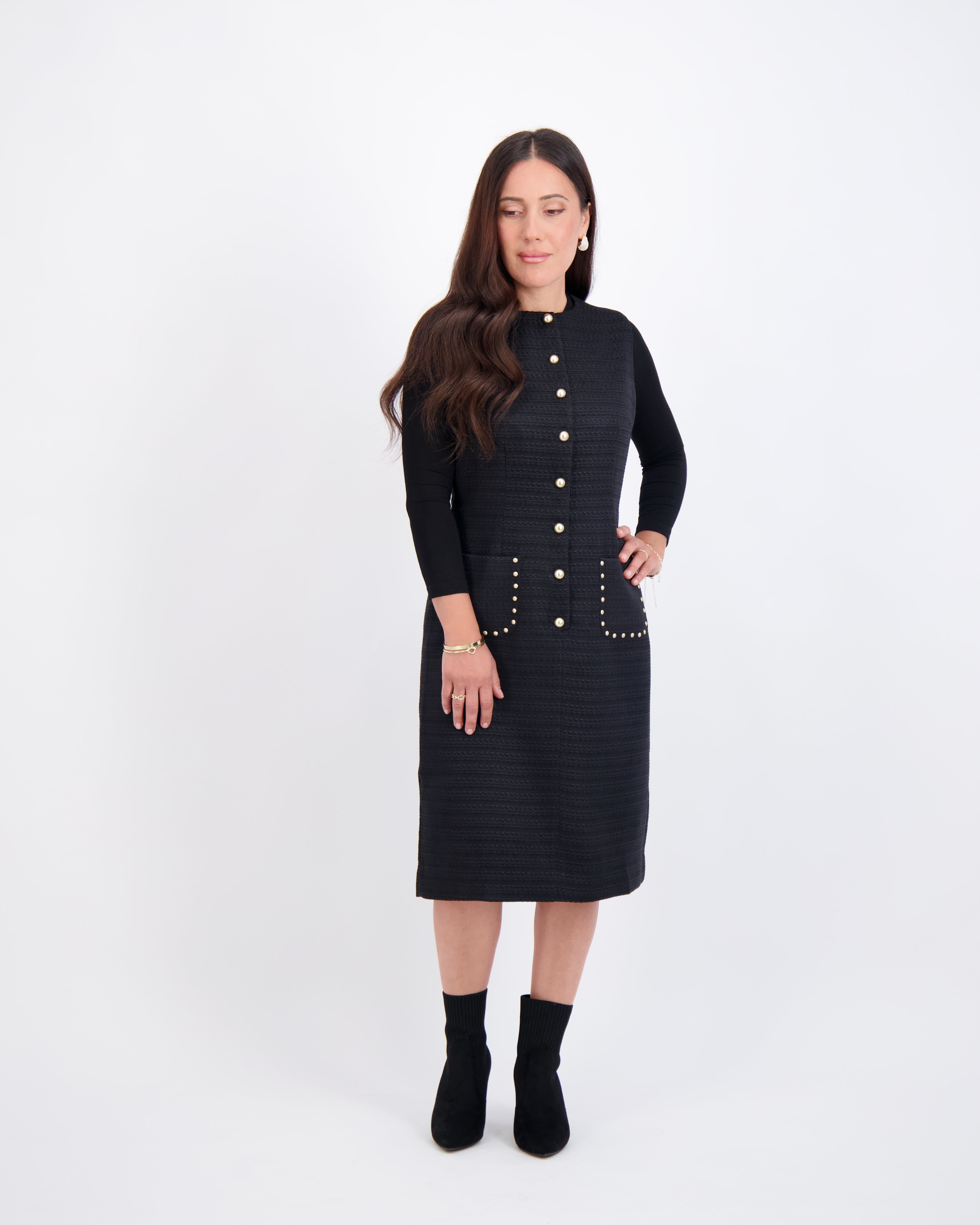 Modest, petite fashion, styled to fit from shoulder to hem.