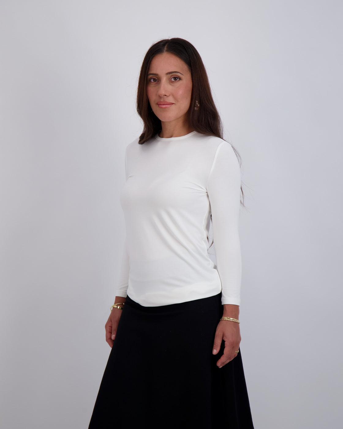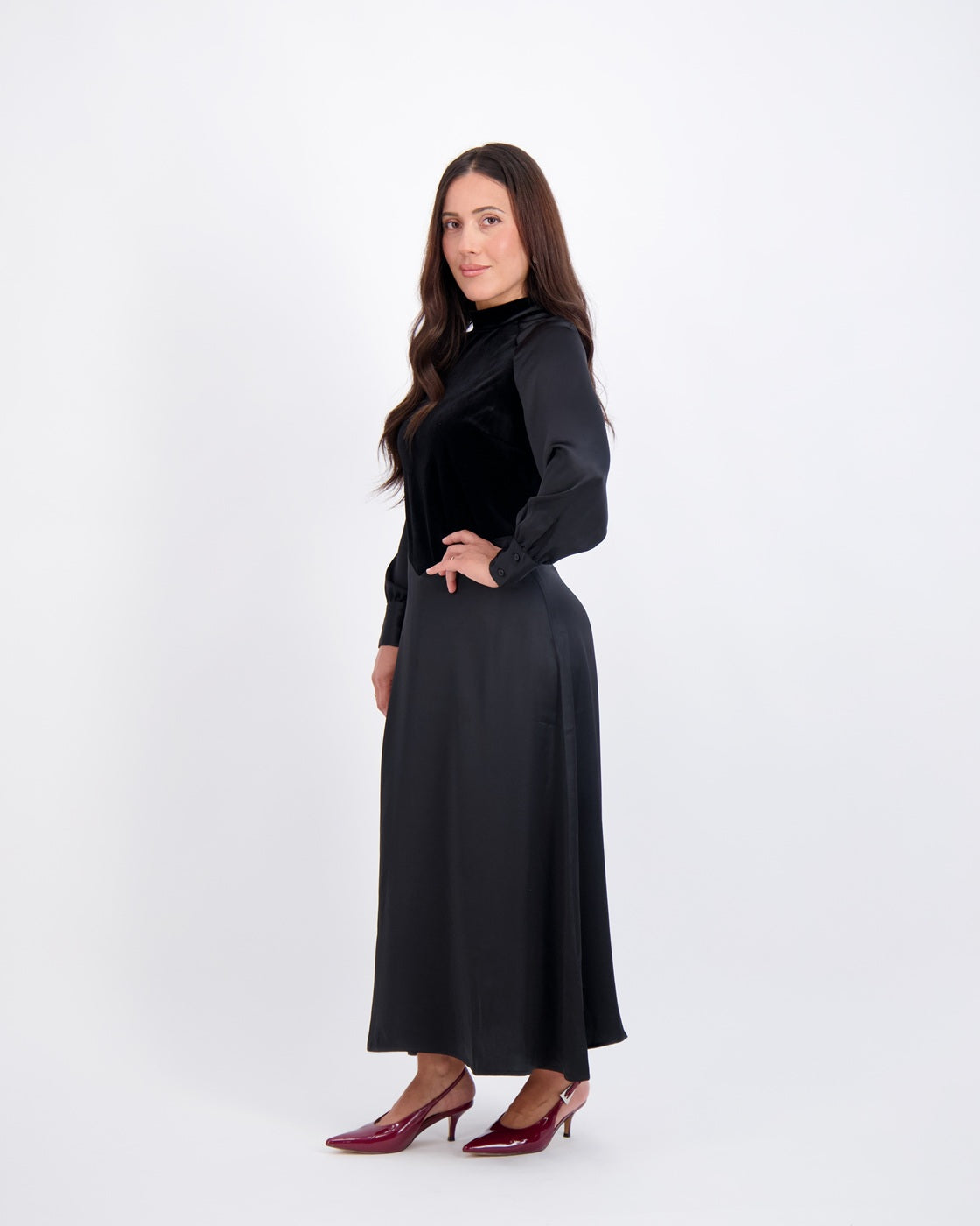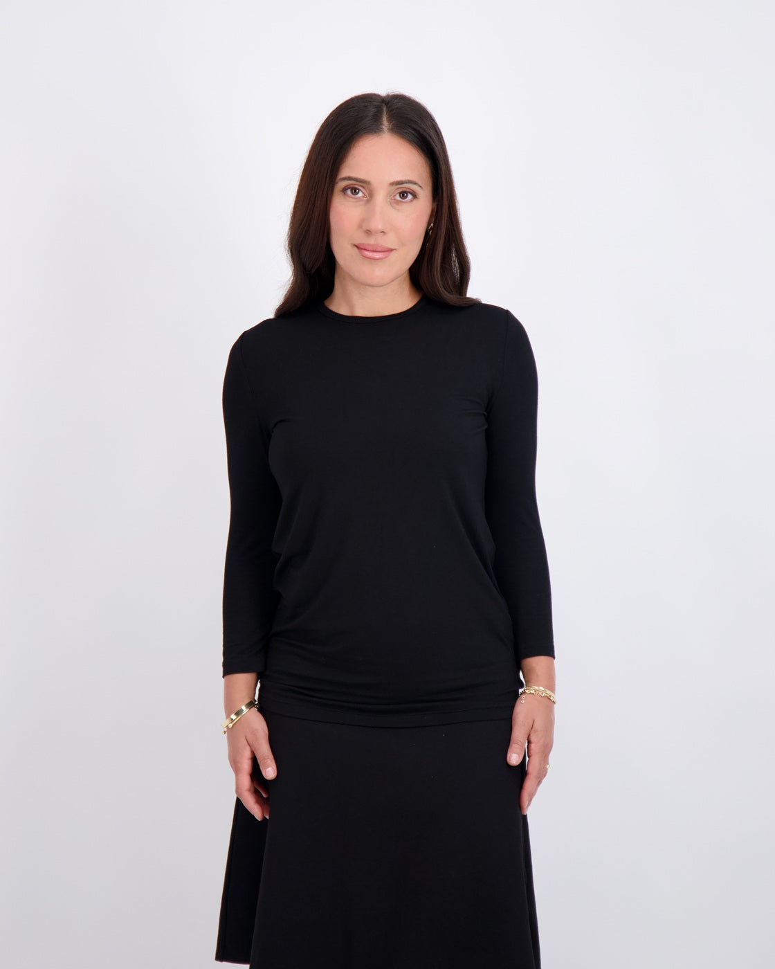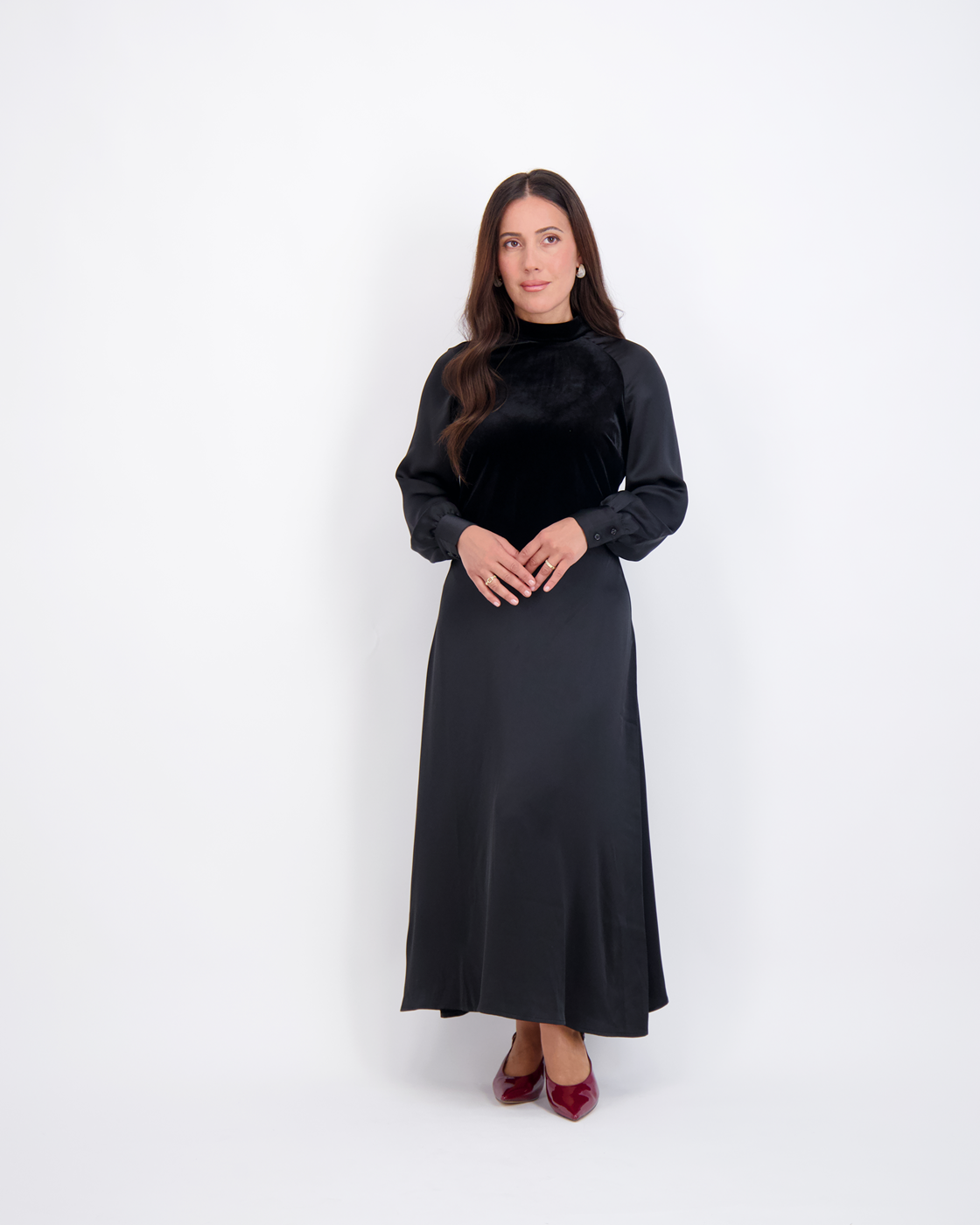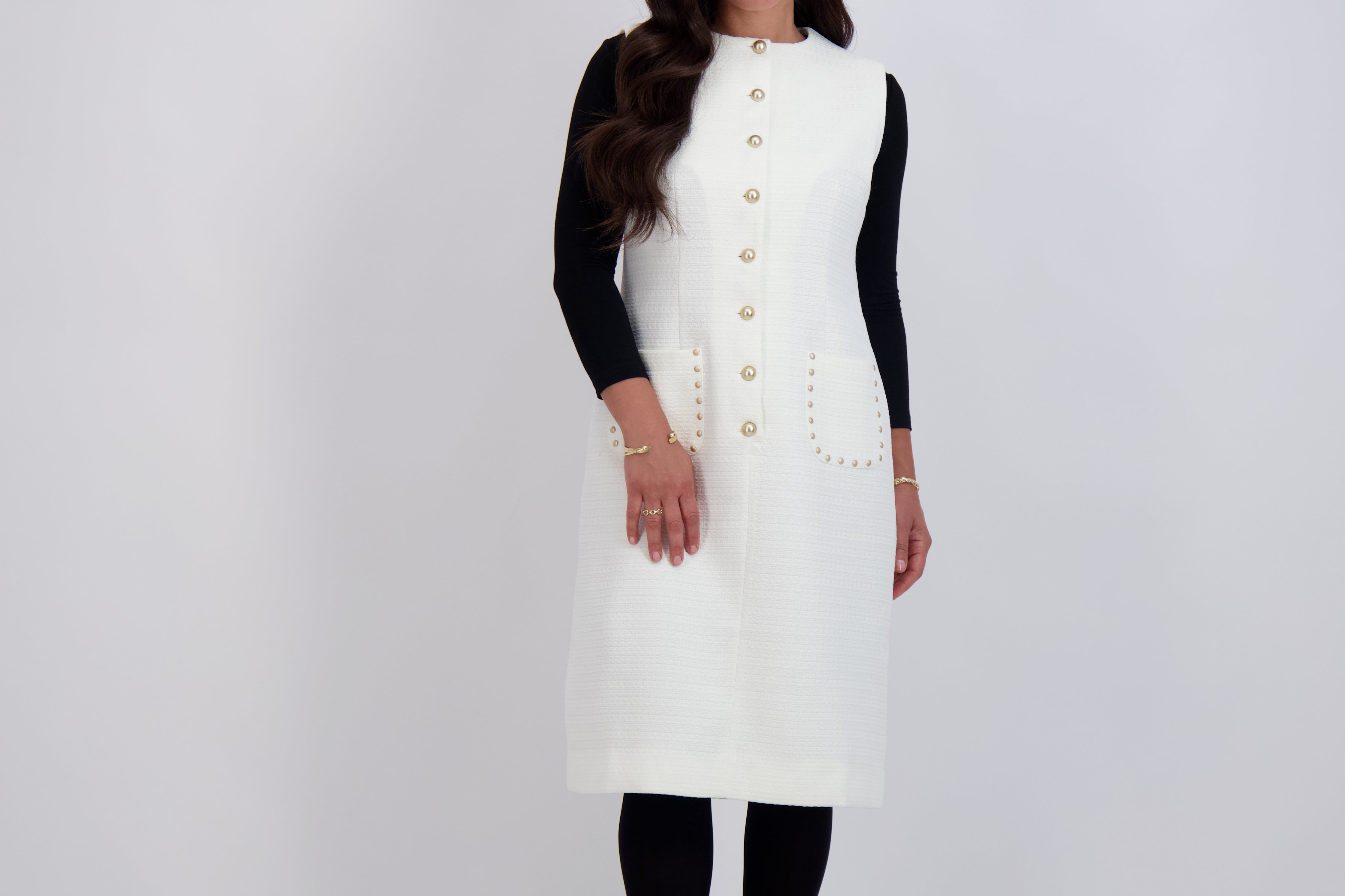 Modest, petite fashion, styled to fit from shoulder to hem.