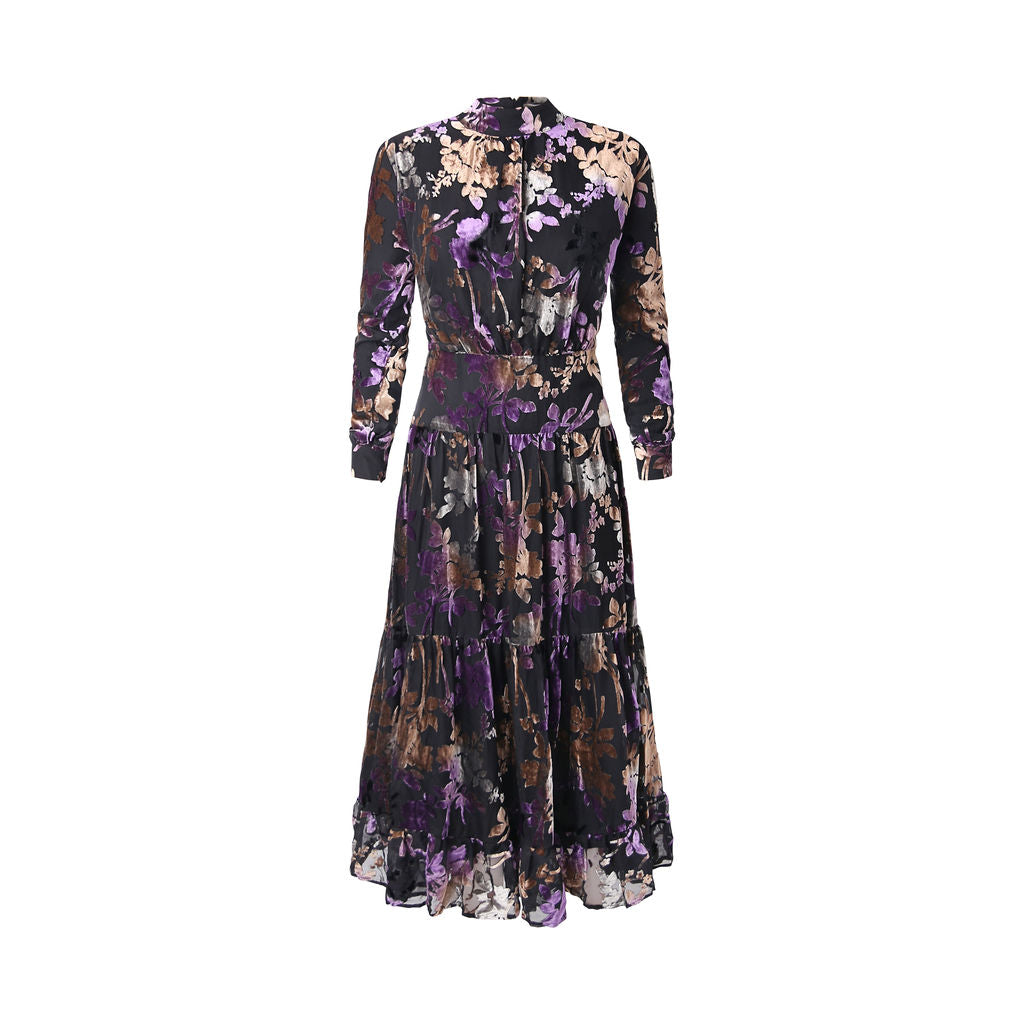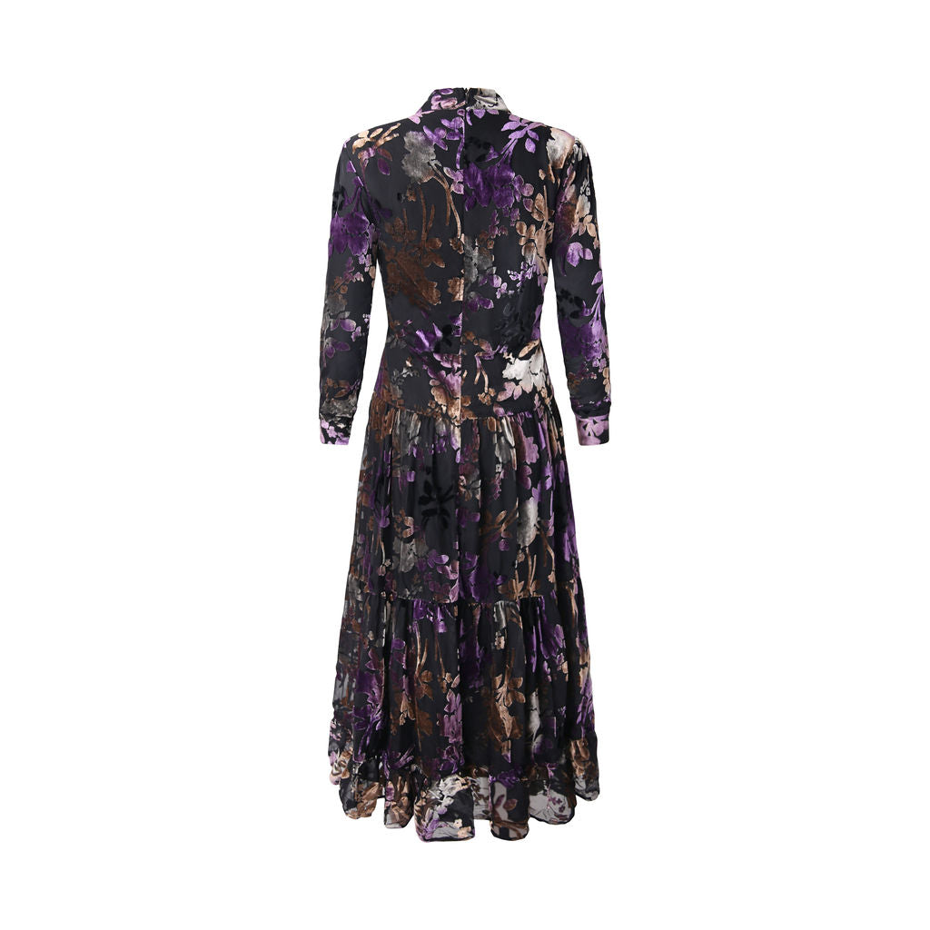 Elevate your evening look with this graceful black dress, embellished with a bold floral design. Detailed with a chic high neckline and long sleeves finished with ruched cuffs, it brings a polished charm to every occasion.
